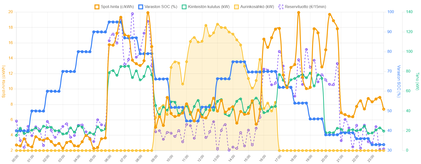 Päivällä aurinkovoimala tuottaa sähköä. Aurinko kattaa kiinteistön kulutusta ja ylimäärä ohjataan varastoon tai reservimarkkinoille. EMS tasapainottaa ja optimoi kulutuksen, varastoinnin ja reservituotot.