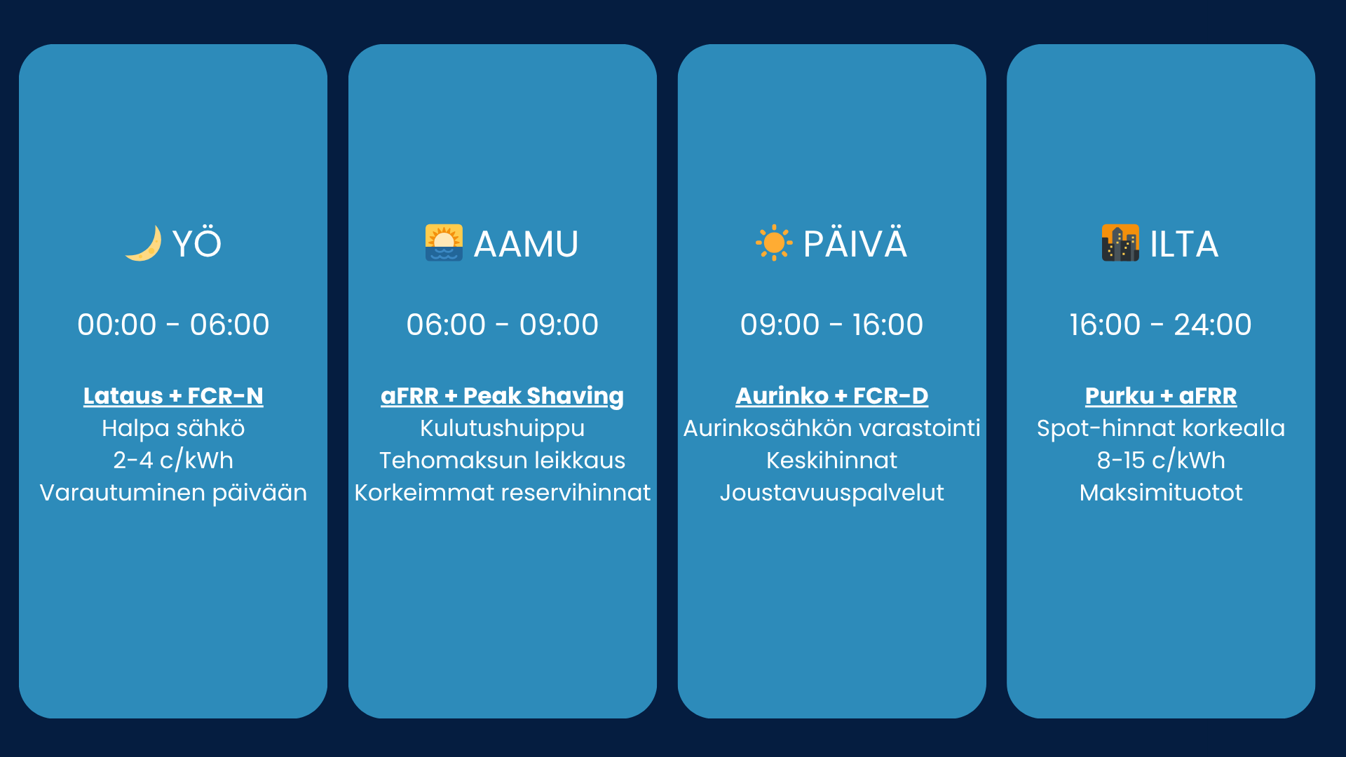 Yöllä sähkö on halpaa ja akku latautuu. Samalla akku voi osallistua reservimarkkinoille, jolloin varastointikapasiteetista saadaan tuottoa.